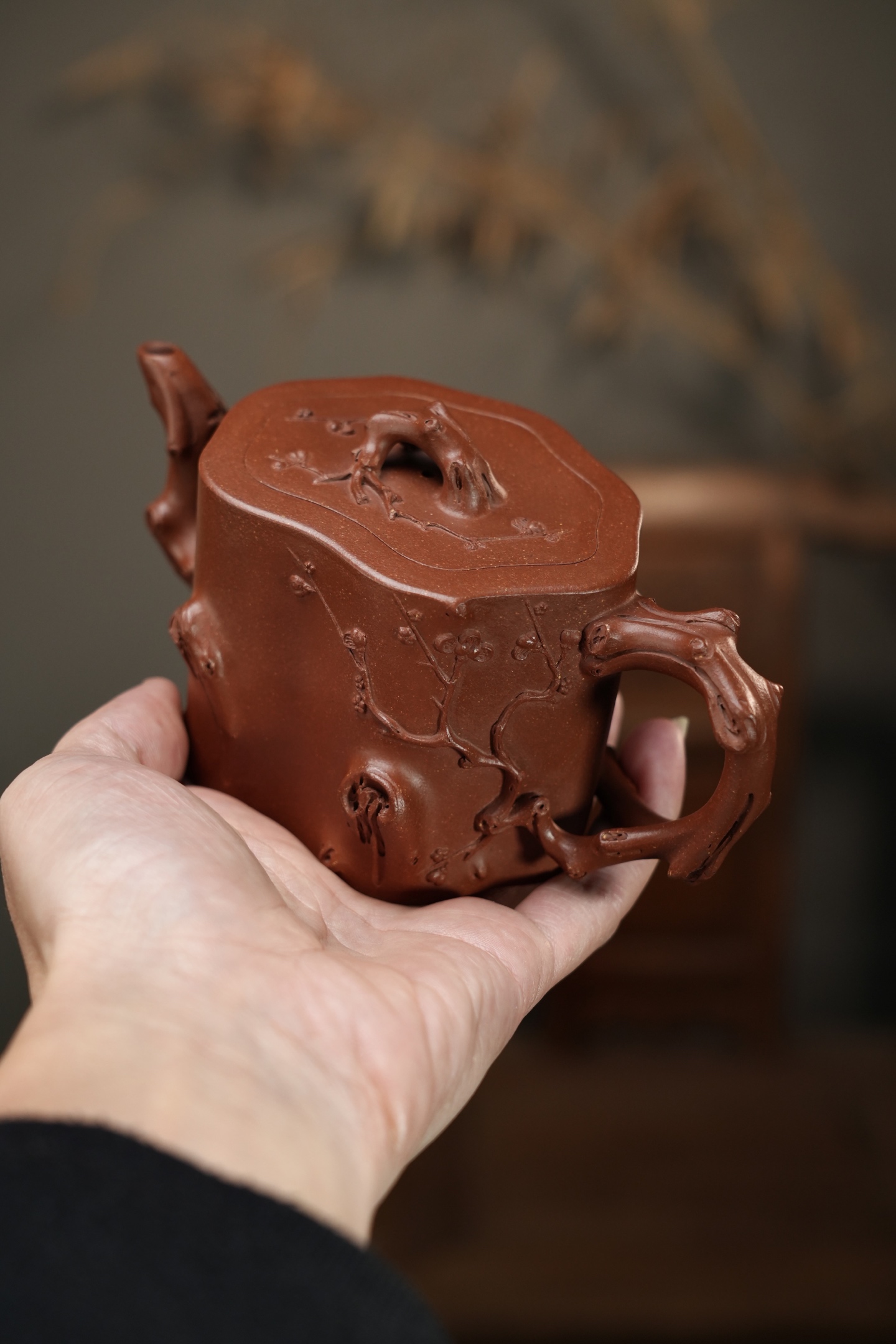 梅桩壶以老梅树根为原型,壶身多取苍劲虬曲的老干,表面刻划树皮皲裂的肌理,节疤处用“堆泥”或“贴塑”技法模拟瘤状凸起,枝桠则顺势延伸为壶嘴、壶把,甚至缀以梅花(常用朱泥点染)。其造型讲究“瘦、皱、漏、透”:瘦显清癯,皱见岁月,漏通灵气,透含生机。