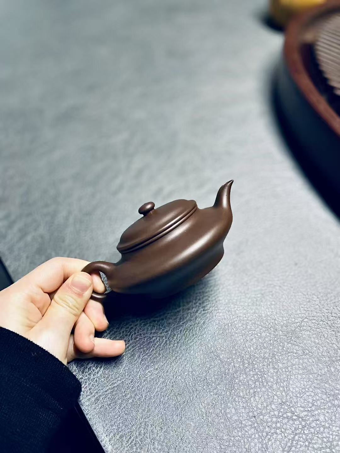 冬季室温低,段泥壶散热快,可在壶外裹一层“棉麻壶套”(避免用化纤材质,易生静电吸灰),既保温又防烫手,同时减少因频繁加热导致的铁质氧化。