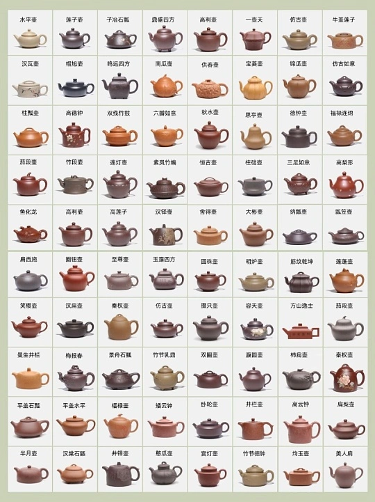 - 梨形壶(清·惠孟臣):壶身如梨,上小下大,流把圆润,朱泥制者尤佳。