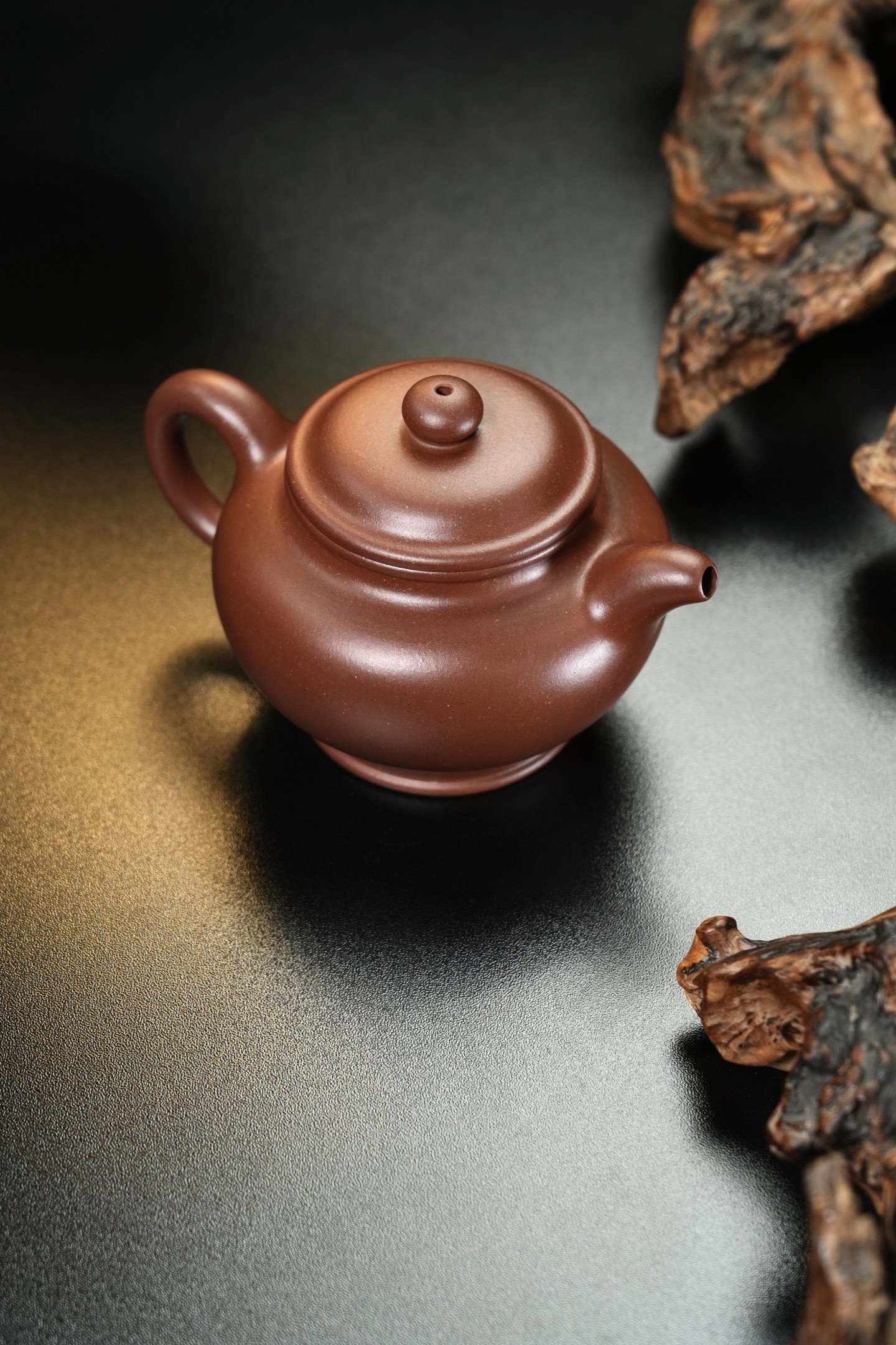 在工艺细节上,“掇只壶”展现了登峰造极的制壶技艺。壶身泥片厚度仅2.5毫米,却历经千锤百炼仍保持均匀。壶盖与壶口的配合精度达到0.1毫米,即便倒置亦滴水不漏。最令人惊叹的是壶把的“过桥”设计:在仅3厘米宽的壶把上,竟开凿出两个直径8毫米的透气孔,既保证空气流通,又不影响整体强度。这种“于细微处见真章”的功力,使“掇只壶”成为检验制壶技艺的“试金石”。