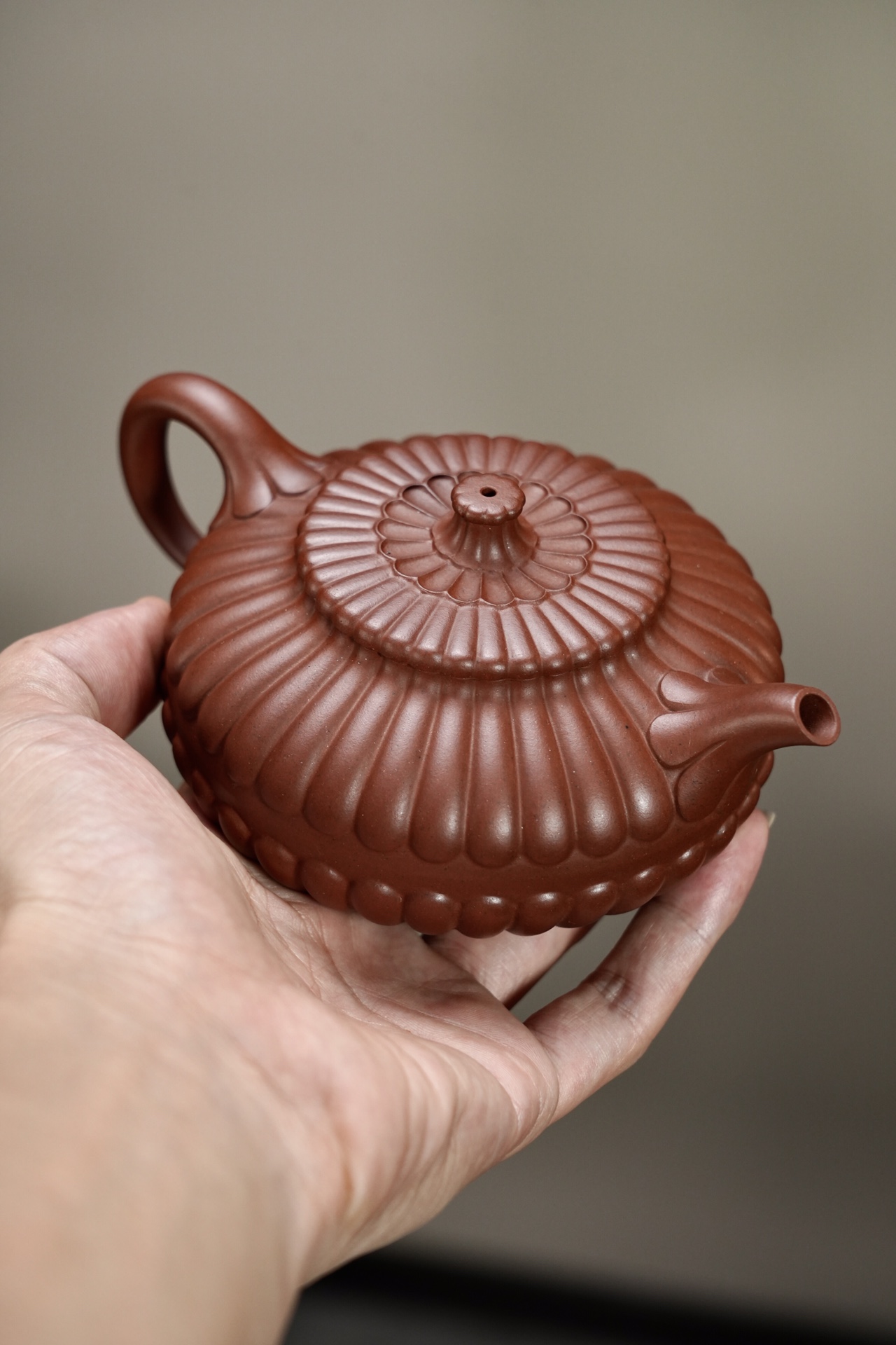 • 将清洁后的紫砂壶完全打开 (Fully Opened):壶盖与壶身分离,壶口朝上,壶盖侧放或倒扣(注意保护盖面包浆 (Patina))。